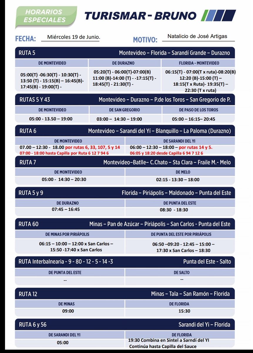 Turismar puso en conocimiento los horarios especiales para este miércoles 19 de junio con motivo del Feriado por el Natalicio de José Gervasio Artigas.